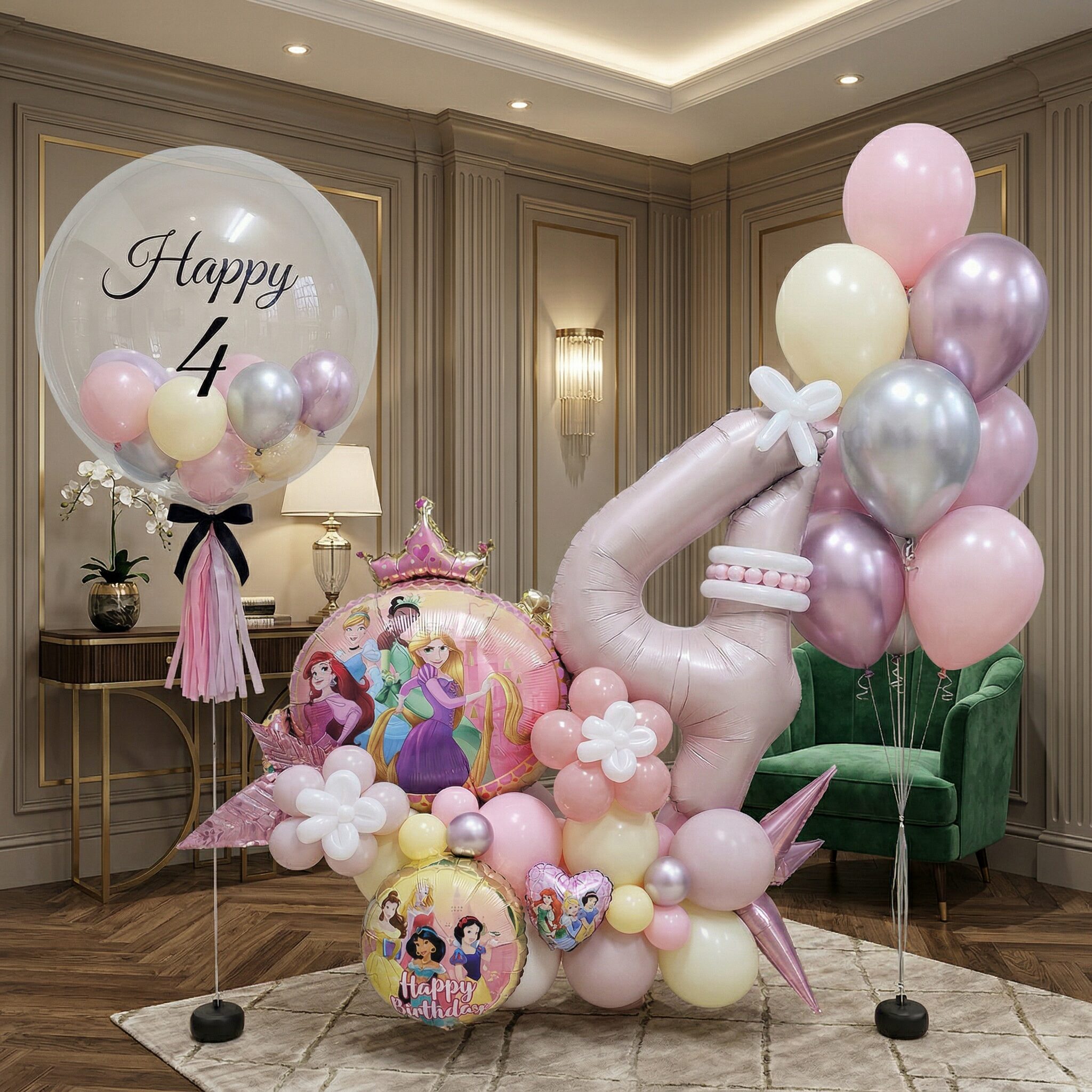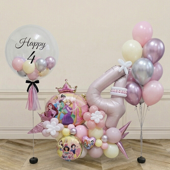 Bring a fairytale feel to your celebration with this Disney Princess pink birthday balloon centerpiece. Designed in a charming pink palette, it features beloved princess character balloons arranged above a coordinating balloon base, creating a standout focal point for your party table. Ideal for Disney Princess-themed birthdays, this centerpiece adds instant colour, character, and photo-ready appeal to cake tables, gift tables, and party displays.