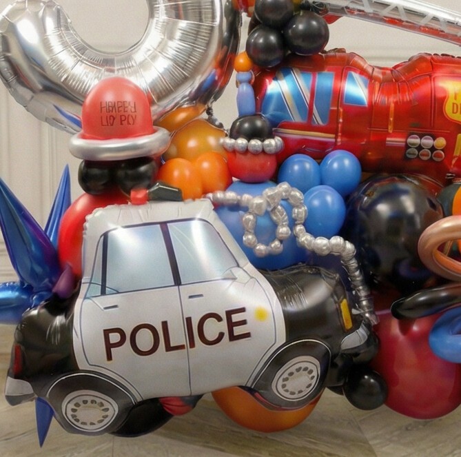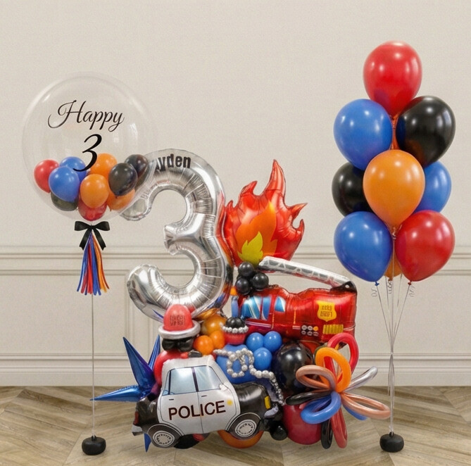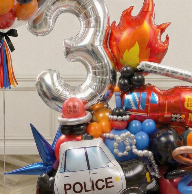 Bring action-packed excitement to your party with this Emergency Rescue Team balloon centrepiece. Featuring a bold fire balloon message alongside a bright red fire engine and a classic police car, this standout display is designed to suit rescue-themed celebrations and vehicle-mad kids. The vivid colours, fun character details and layered 3D look make it an ideal focal point for photo moment or party entrances, creating an instant theme-setting moment for your birthday setup.