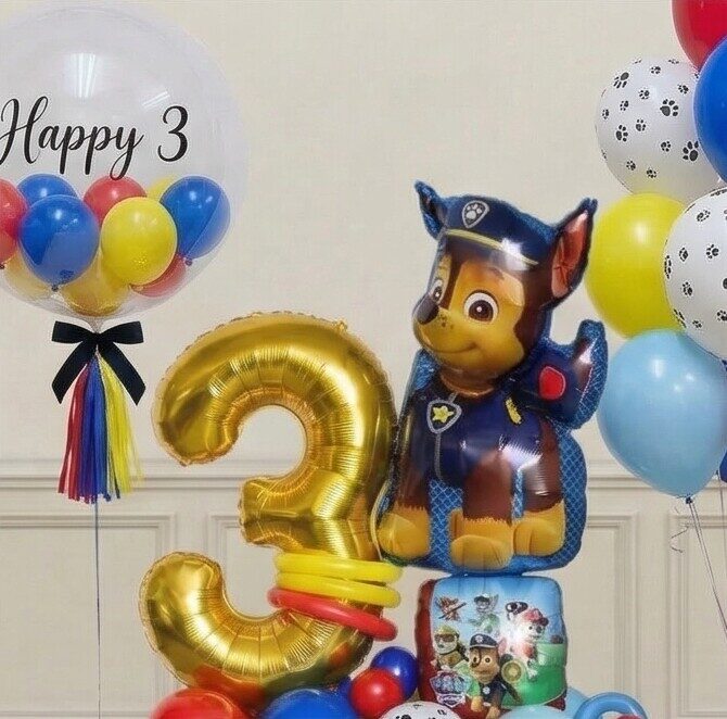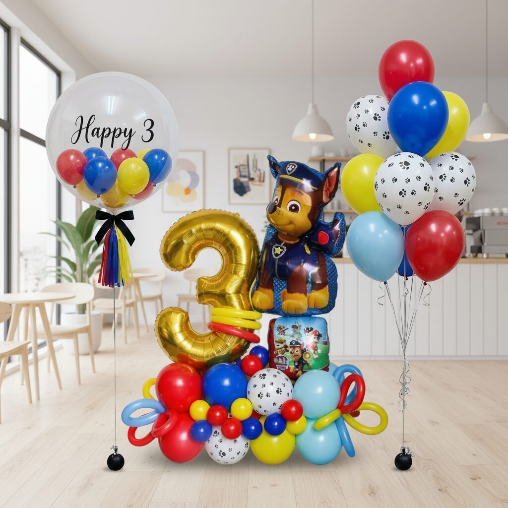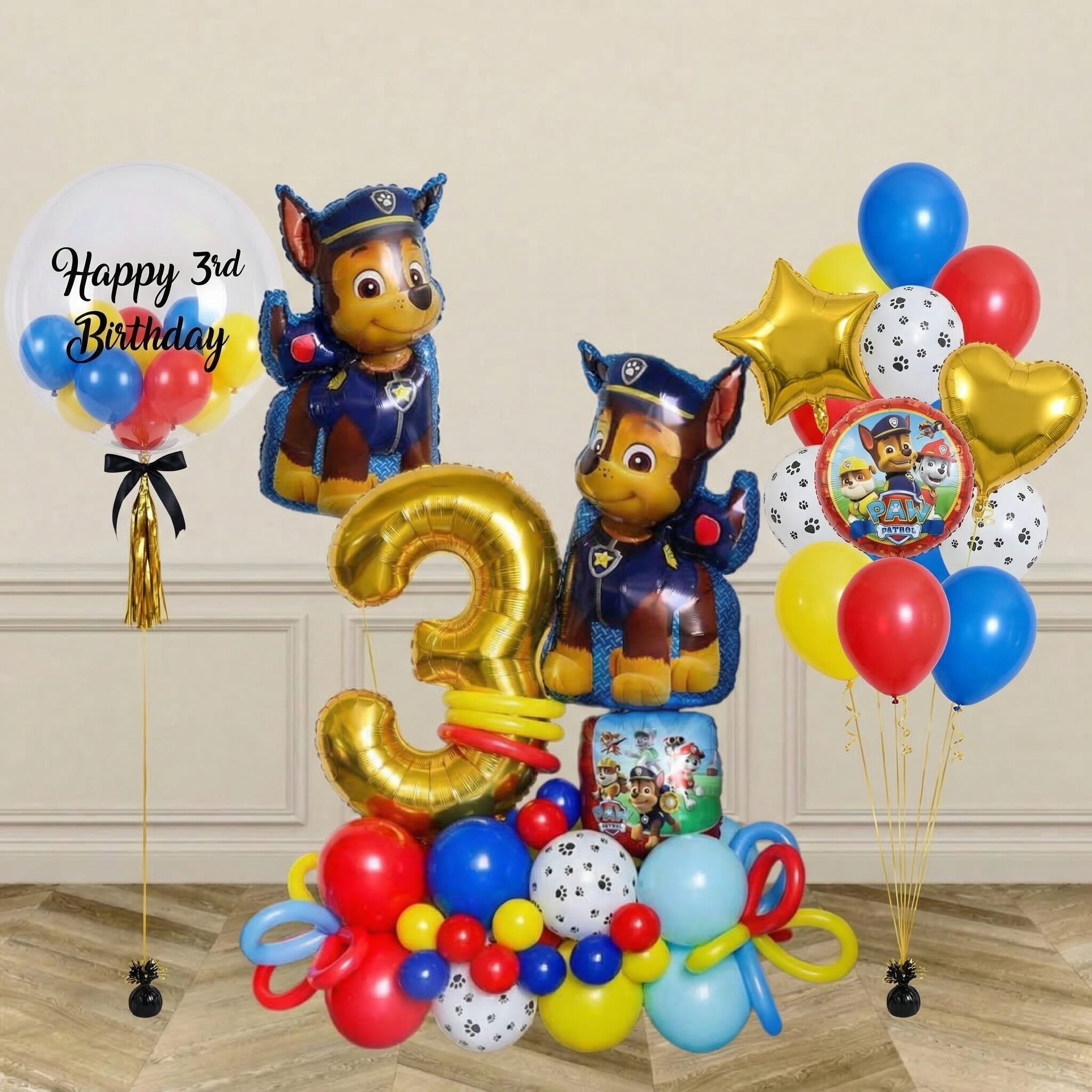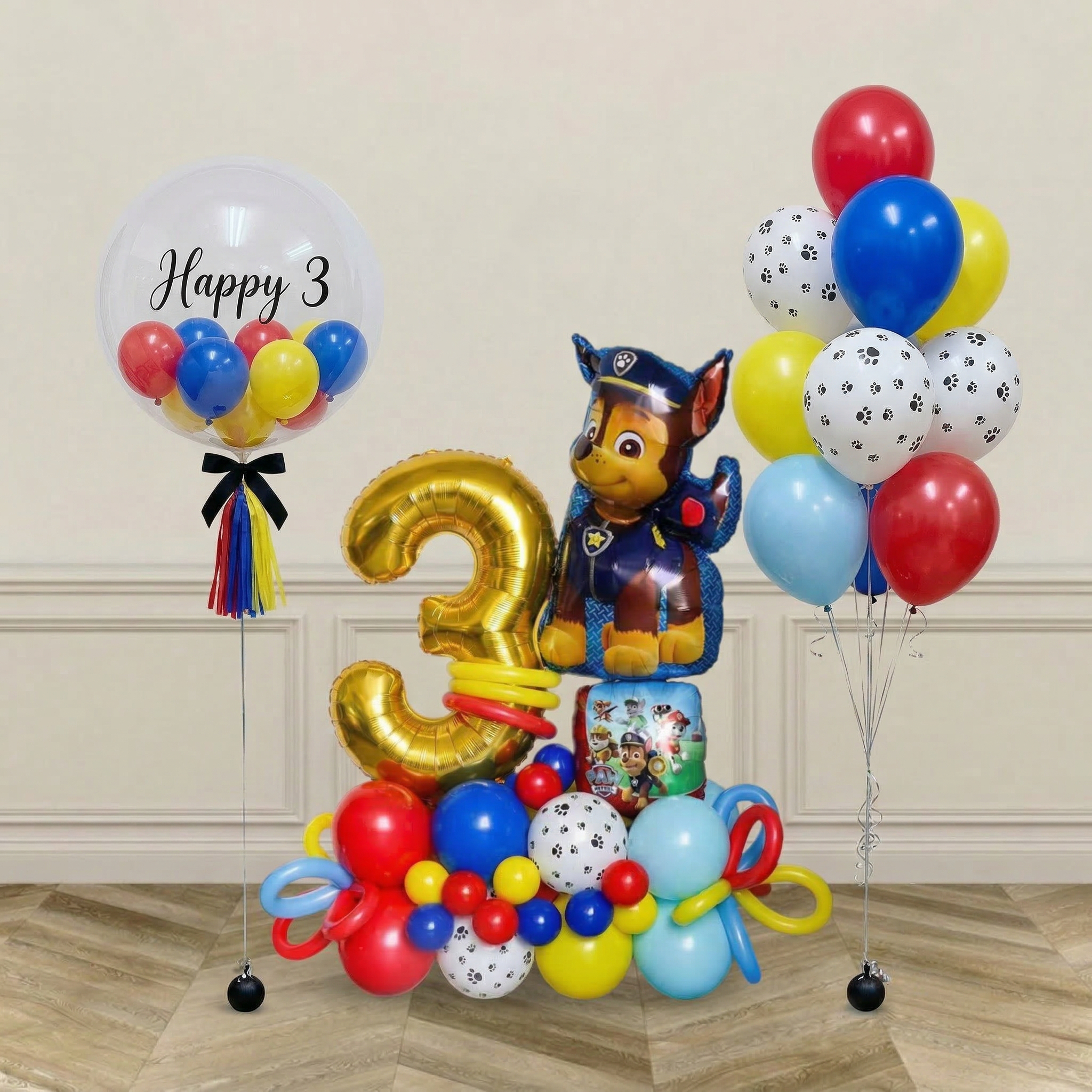 Bring the Paw Patrol fun straight to your party with this Paw Patrol Chase Signature Balloon Centerpiece. Featuring a bold, full-colour Chase character balloon paired with coordinating blue balloons and playful printed paw details, this eye-catching arrangement is made to stand out as a focal point for birthdays and themed celebrations. Ideal for dessert tables, gift tables, or party entrances, it adds instant Paw Patrol excitement and ties your decorations together with a bright, character-led finish.