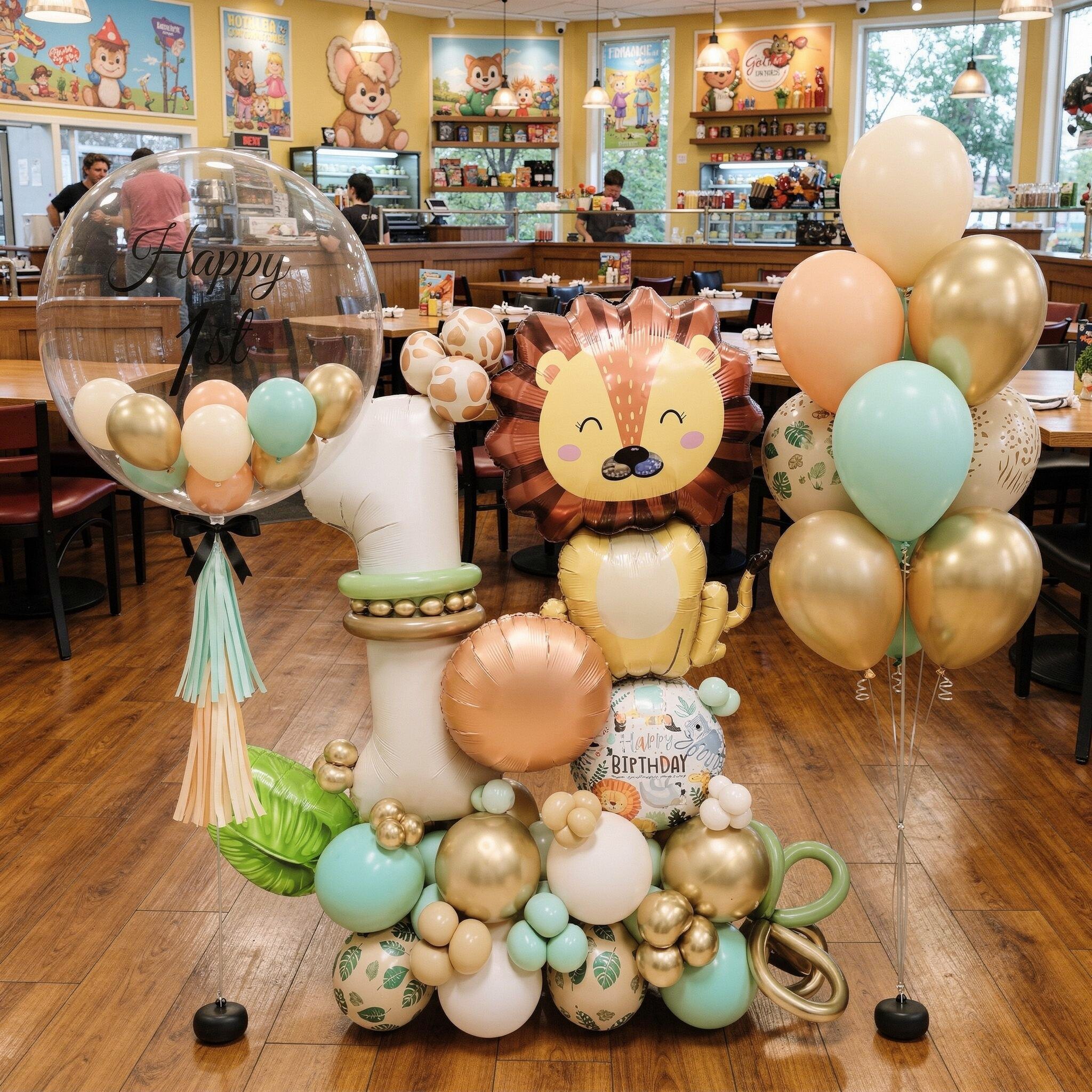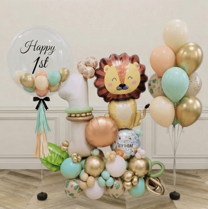 Bring the adventure of the savannah to your celebration with this Wild Safari Lion King Signature balloon centerpiece. Featuring a bold lion balloon framed by lush green palm leaves and jungle-inspired accents, this eye-catching arrangement creates an instant focal point for safari, jungle and animal-themed parties. The layered textures and vibrant colours make it ideal for party displays and gift stations, adding a fun, themed finish to birthdays and special events.